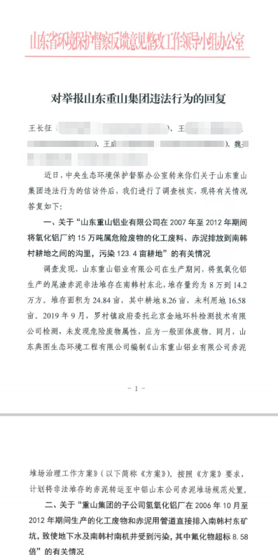 同年12月12日,山东省环境保护督察反馈意见整改工作领导小组办公室反馈称,调查发现,山东重山铝业有限公司生产期间,将氢氧化铝生产的尾渣赤泥非法堆存约8万到14.2万方。堆存面积24.84亩,为一般固体废物……南韩村南水井检测,氟化物超标4.6倍……但尚未发现山东重山集团排放含氟污染物的确定证据和机井水氟化物污染的准确来源。