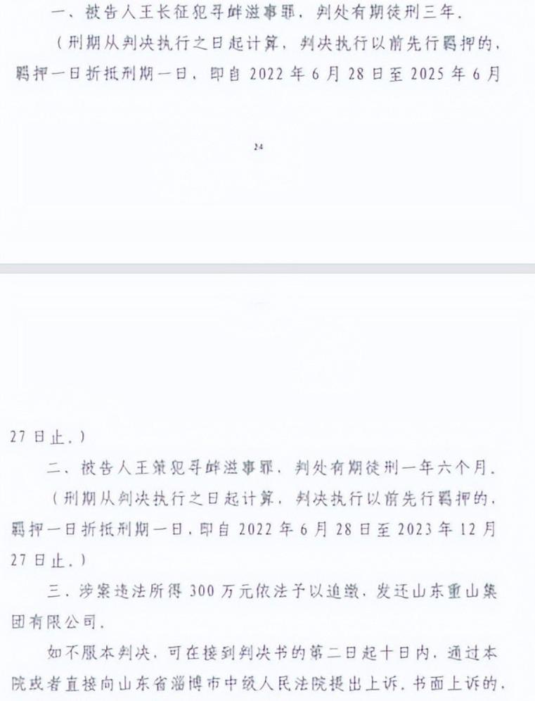 2023年12月21日,淄川区法院一审判决。判决书显示,法院认为,从表面看,此案系山东重山集团就王长征被打伤一事达成赔偿协议,赔偿300万元人身损害赔偿,实质是被告人王长征长期、频繁投诉给山东重山集团生产经营造成不利影响下,以被该公司保安打伤为借口,借协商之机,利用签署赔偿协议的形式达到向山东重山集团敛取巨额财物的非法目的……王长征犯寻衅滋事罪,判处有期徒刑三年;王策犯寻衅滋事罪,判处有期徒刑一年六个月。涉案违法所得300万元依法予以追缴,发还山东重山集团。