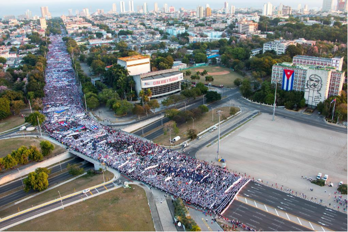 古巴民众在哈瓦那参加“五一”国际劳动节集会游行,反对美国对古封锁。
